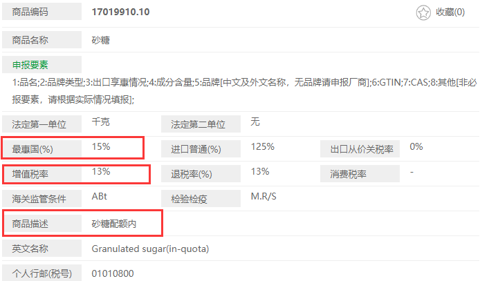 HS編碼1701991010,關(guān)稅15%,增值稅13%